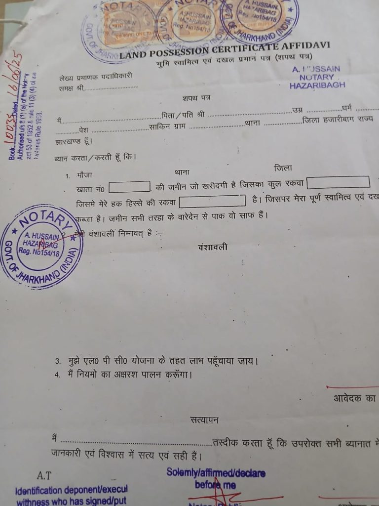 A shocking affidavit racket has come to light in Chauparan, where photocopy and document shops near the Block Mod and Block Campus are reportedly selling pre-signed and pre-notarized affidavits — openly and without any official scrutiny. These affidavits, allegedly notarized in Barhi or Hazaribagh, are being sold locally with blank spaces for names and dates, ready to be filled in by buyers on demand.