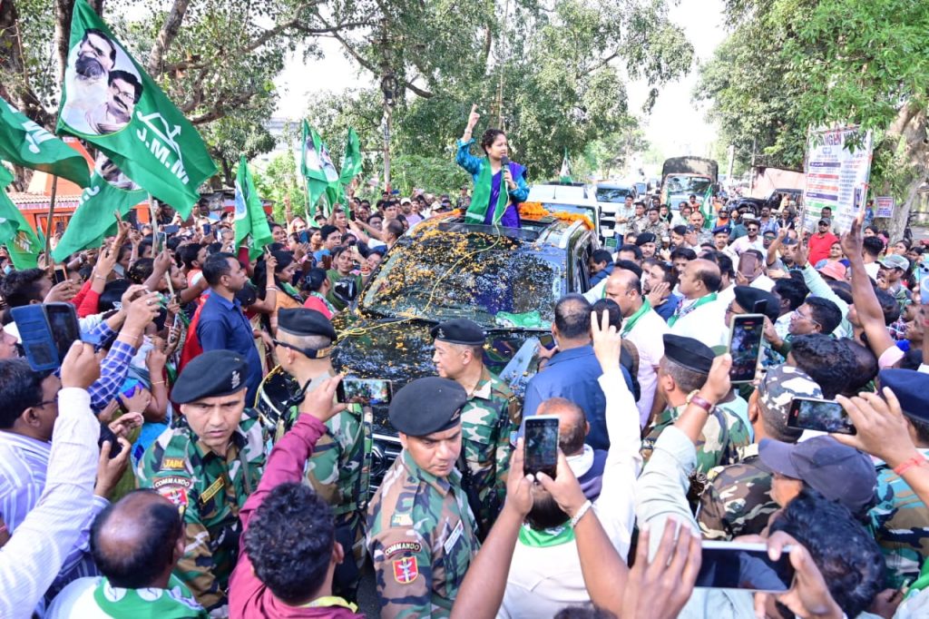 During the roadshow, residents lined the streets, welcoming Kalpana Soren with flower garlands and chanting slogans of “Jharkhand Mukti Morcha Zindabad”, turning the entire area into a festive election atmosphere. As her convoy passed through different localities, huge crowds gathered on both sides of the road to catch a glimpse of the leader.